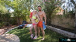 Cecelia Taylor teases in yellow bikini and pink booty shorts with water guns before stripping nude poolside, her skinny frame, sexy thighs, small pink-nip breasts and wet very pink pussy exposed. Sam Shock gropes her tits, then she strokes and sucks his cock deep on all fours, pigtails gripped. He eats her out, fucks her spread legs missionary, prone bone with big white vibrator buzzing her clit, reverse cowgirl where her cum-filled pussy grips him tight. Doggy pounding her tight hole, standing carries, she rides him hard legs spread until creampie oozes from her shaved snatch and facial cumshot blasts her pretty face.